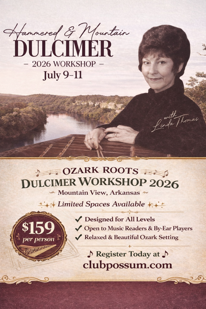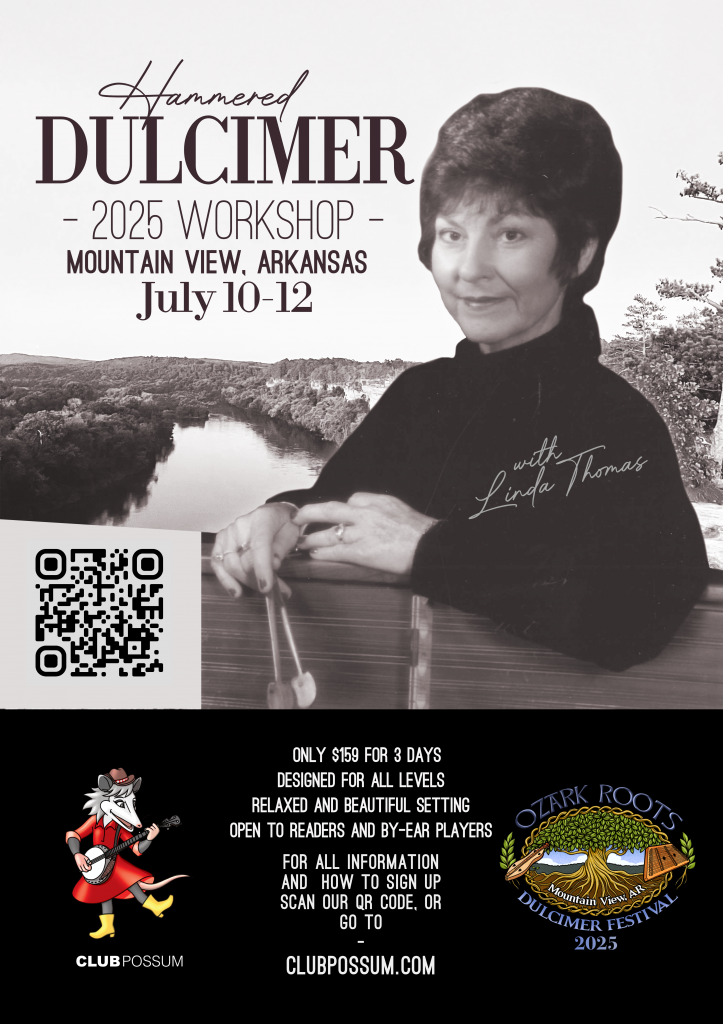 Join veteran hammered dulcimer instructor Linda Thomas for her fourth year teaching an all-level hammered dulcimer workshop in the beautiful mountain town of Mountain View, Arkansas. This workshop is for all levels and both readers and ear learners.